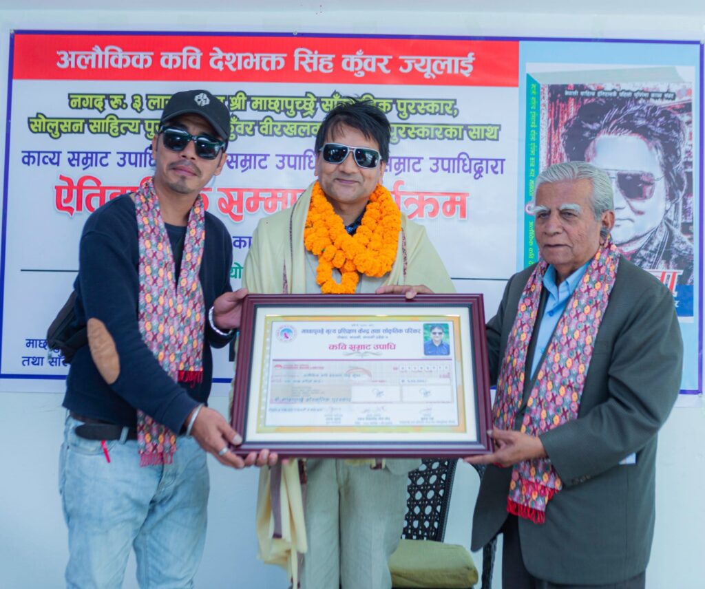 तीनवटा उपादी बाट क्रमश मान्छापुच्छे नृत्य प्रशिक्षण केन्द्र तथा साँस्कृतिक परिवार,पाेखरा बाट कवि सम्राट पि एच साेलुसन बाट काव्य सम्राट र कुँवर वीरखलक नेपाल पाेखरा बाट कविताबाटसम्राट गरि एक एक लाख गरि तीन लाख साथै दाेसाेल्ला तथा प्रमाण पत्रबाट सम्मानित भएका छन् ।