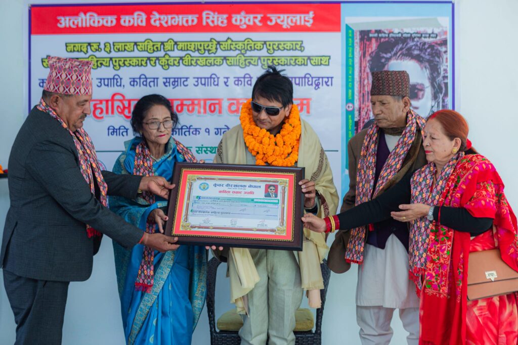 अलाैकिक कवि देशभक्त सिंह कुँवर लाई सम्मान गरेका छन् । बुधबार रामबजारकाे एक कार्यक्रममा विभिन्न बिदा बाट सम्मान गरेको डा.यम बहादुर पाैडेल क्षेत्रीले कास्की खबरलाई बताए ।