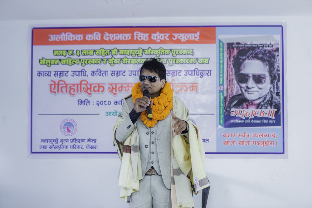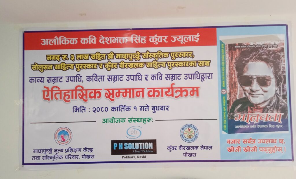 अलौकिक कवि देशभक्त सिंह कुँवर पोखरामा ३ वटा संस्थाहरु कुँवर वीरखलक नेपाल , पिएच सोलुसन नेपाल र माछापुच्छ्रे नृत्य प्रशिक्षण केन्द्र तथा साँस्कृतिक परिवारद्वारा काव्य सम्राट उपाधी सहित सोलुसन साहित्य पुरस्कार र कविता सम्राट उपाधि सहित कुँवर वीरखलक साहित्य पुरस्कार र कवि सम्राट उपाधि सहित माछापुच्छ्रे साँस्कृतिक पुरस्कार सहित प्रत्येक संस्थाबाट रु, एकएक लाखको दरले ३ लाख नगद बाट सम्मानित भएका हुन् ।